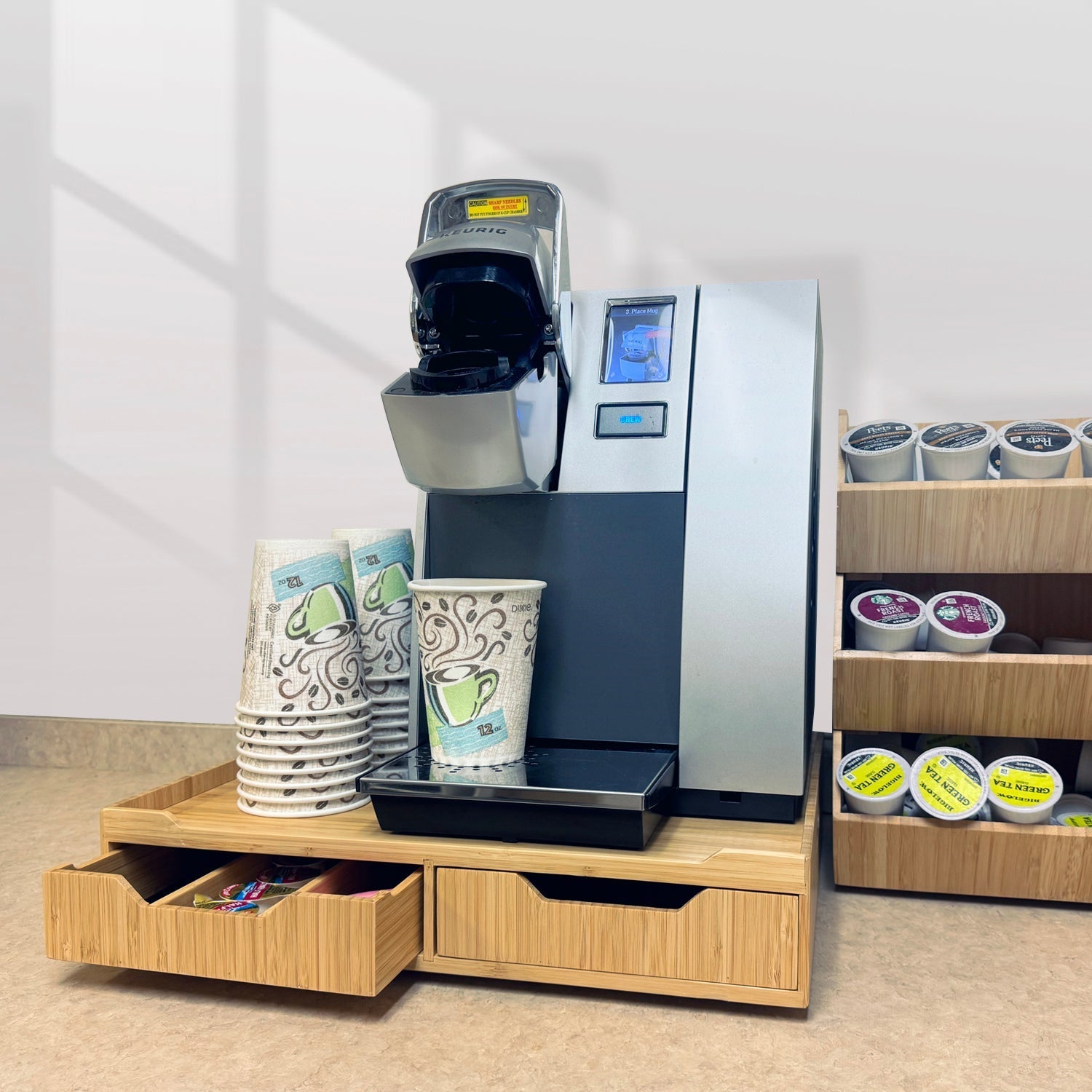 Keep coffee or tea essentials like K-cups, Espresso Pods, tea bags, straws, stirrers, or other compatible Keurig accessories easily accessible with this Bamboo Drawer with Sliding Tray.