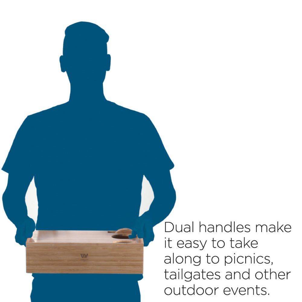 Entertain, enjoy and indulge with a high-quality bamboo wine and cheese serving tray. Entire set includes holders for 2 wine bottles, 4 coasters, 2 individual serving boards, a 4 pc Cheese Knives set, plus a slide out drawer.