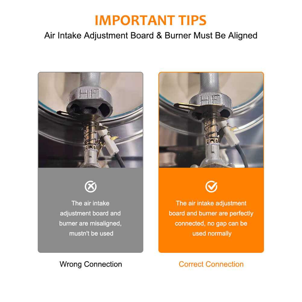 - Important Tips - After receiving the gas stove, please check the bottom of the gas stove, the air intake adjustment board and burner must be aligned. If it is not aligned, please contact our customer service