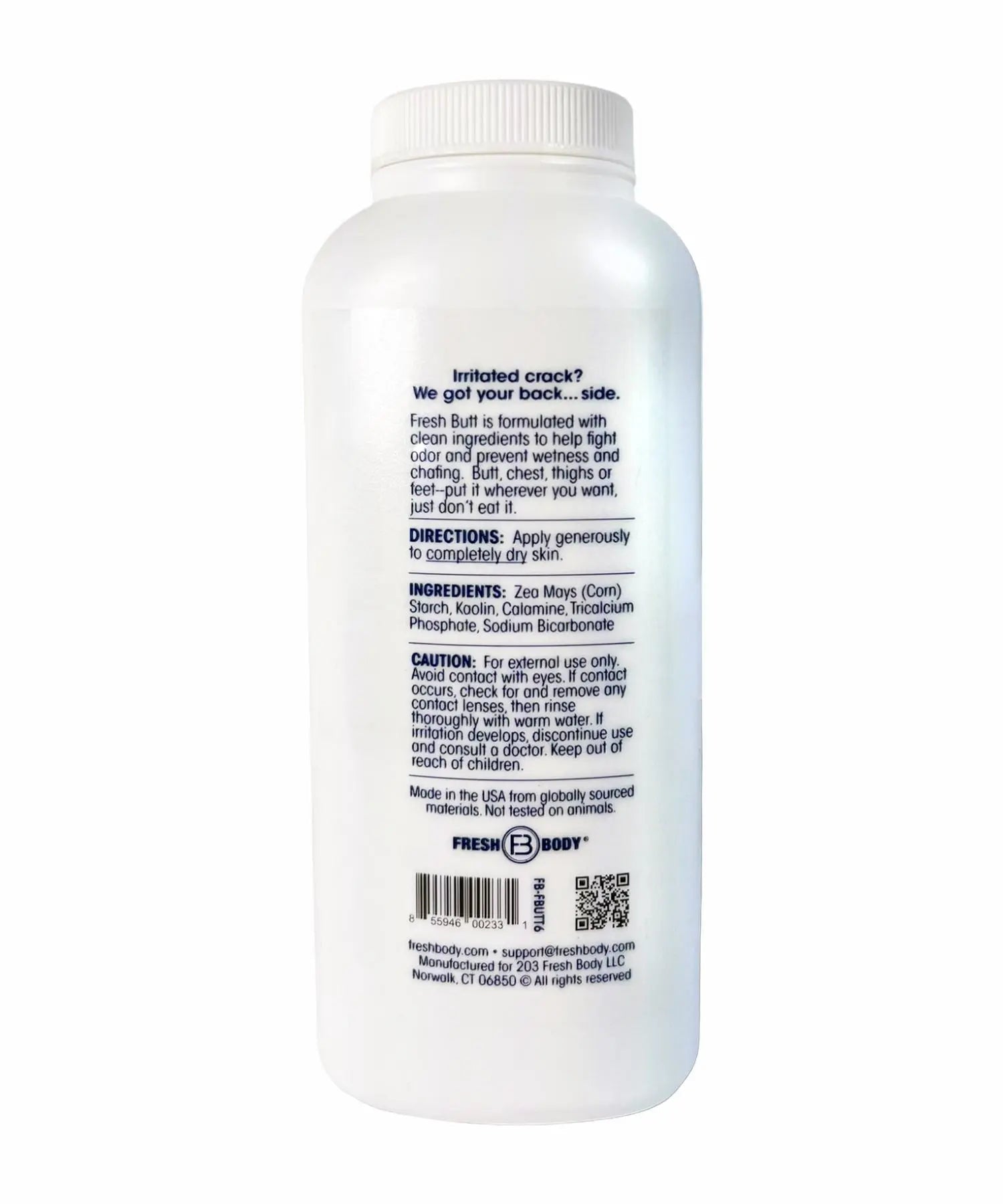 Fresh Butt Women and Men's Body Powder is formulated with clean ingredients to help fight odor, prevent wetness and butt chafing. Buttcrack, chest, thighs, groin or feet — put it wherever you want, just don't eat it (external use only!) Based on a proprietary corn starch based formula, this chafing powder is talc-free and is perfect for those “hard to reach” areas where a lotion won’t do. Deodorant powder is made with calamine (to sooth), kaolin (to stand guard against butt chafing), and sodium bicarbonate (to help tackle odor head-on)! Whether you're cycling, running, horseback riding, hiking, or taking a casual stroll, Fresh Butt Powder is your go-to companion for staying cool and chafe-free! Directions: apply generously to completely dry skin.