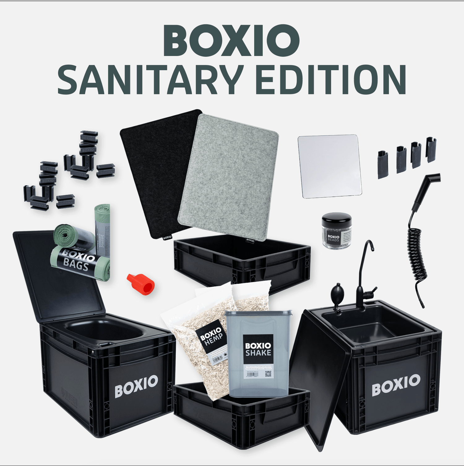 Your compact and robust bathroom in just two Euroboxes. With the comprehensive BOXIO bundle, you always have everything you need with you and can meet your needs anytime and anywhere without electricity.