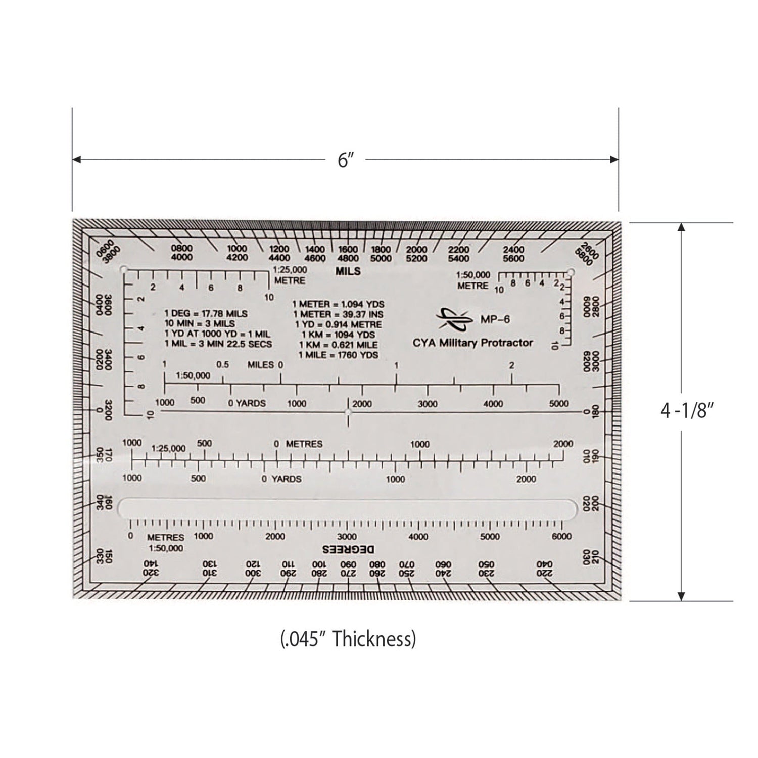 The second is the rectangular MP-6 which is graduated in 1:25,000 and 1:50,000 map scales in both meters and yards for better versatility. The compass rose features dual scales for mils and degrees.