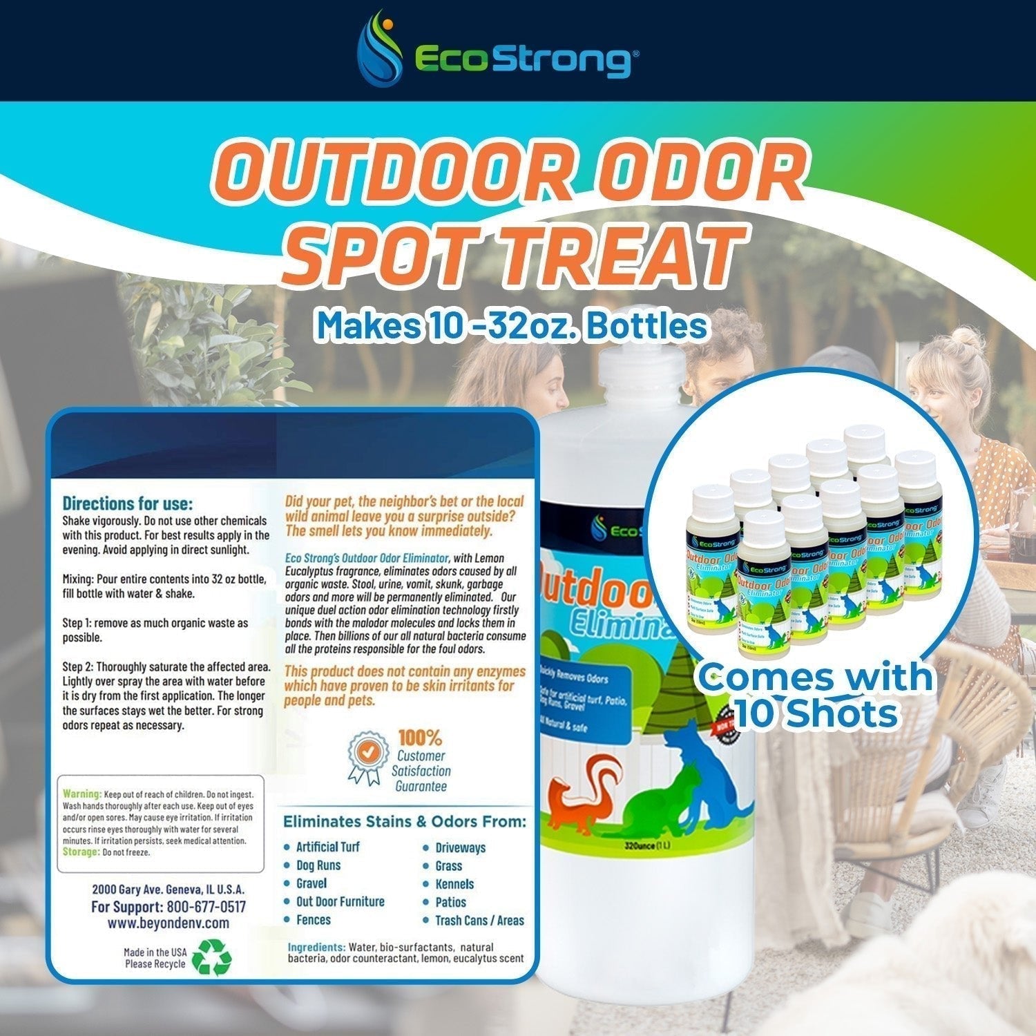 We guarantee the effectiveness of our Outdoor Odor Eliminator with a 60 day money-back guarantee. Try it risk-free and experience the EcoStrong difference today.