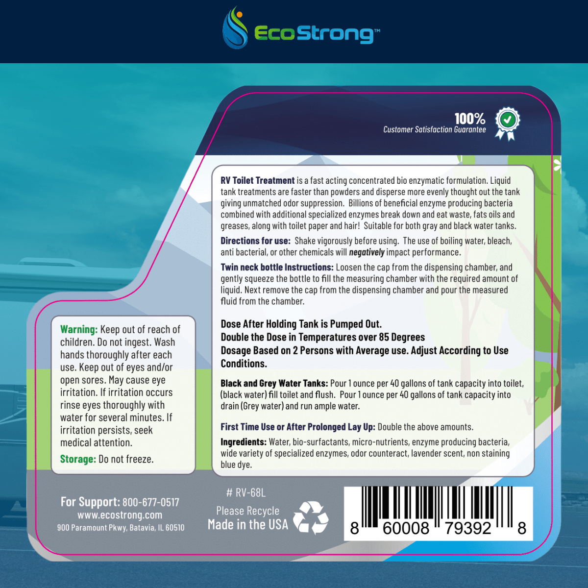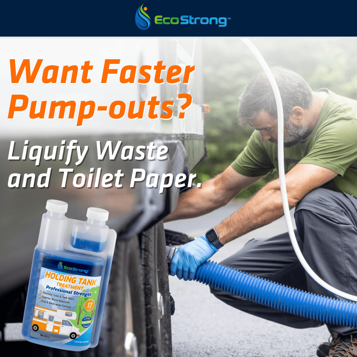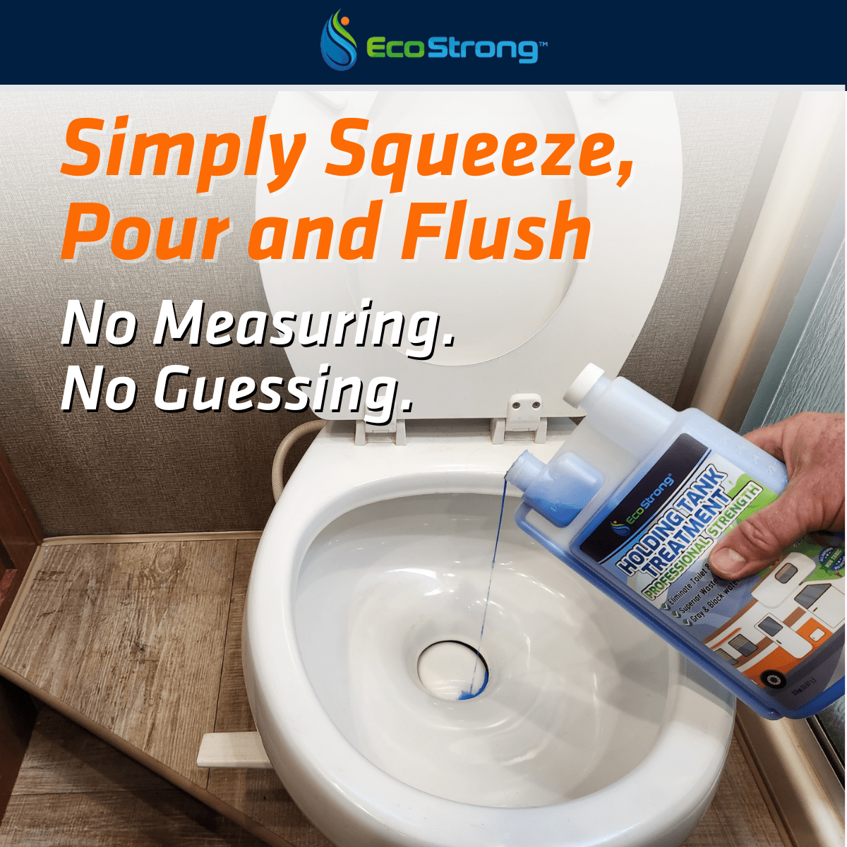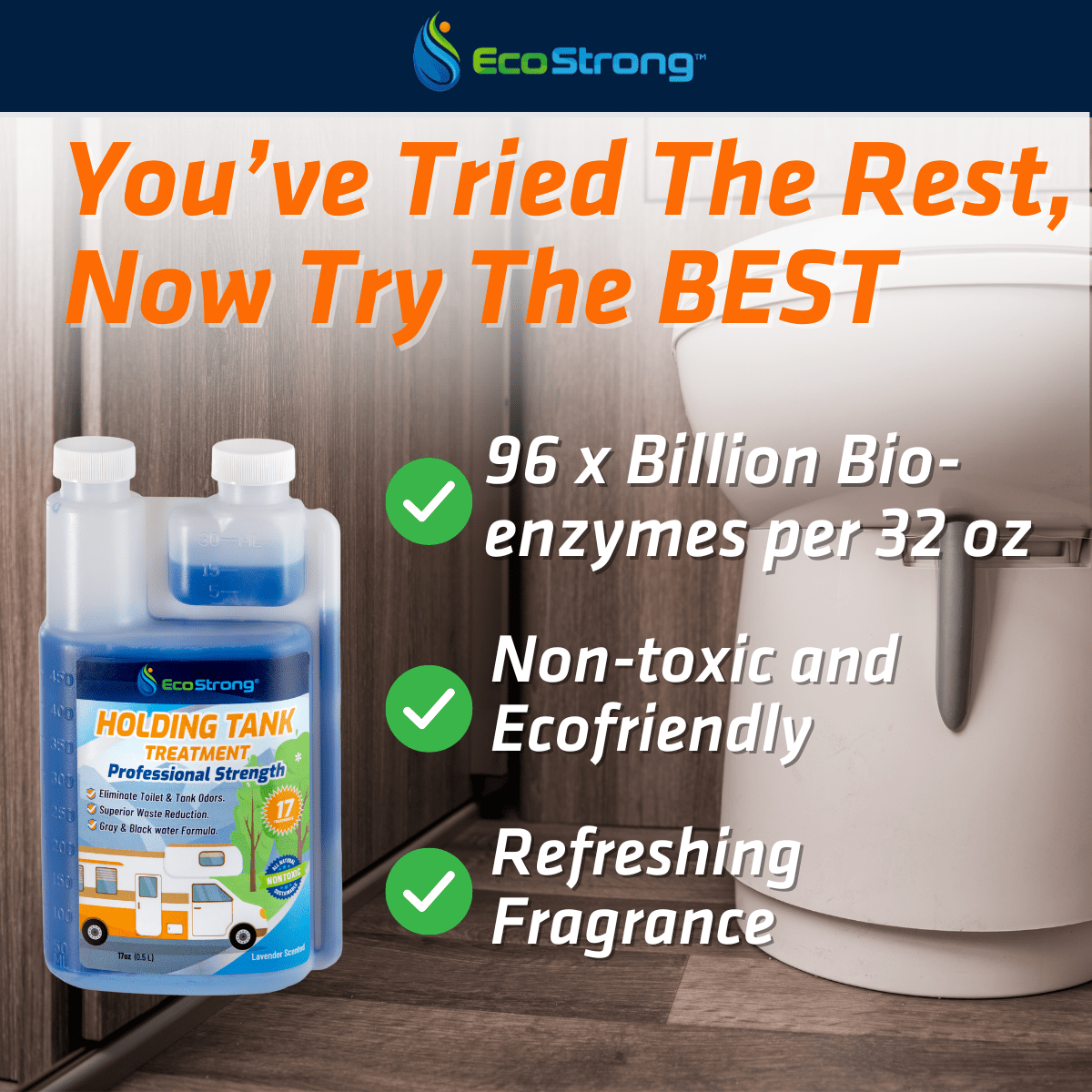 EcoStrong's professional strength bio-enzymatic shots feature a 2-in1 formula that liquifies black and gray water organic solids. It also cleans-dissolves debris that can clog tank sensors.