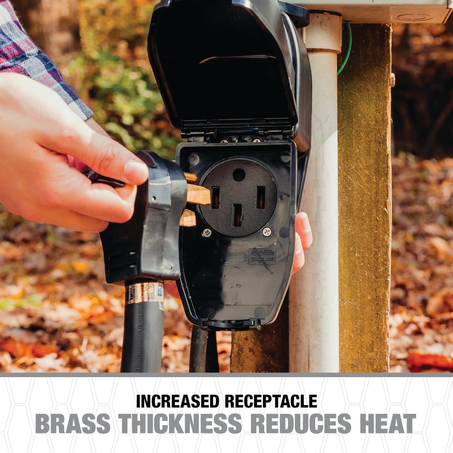 Other features include a fully enclosed receptacle cover, increased receptacle brass thickness to reduce heat, convenient T-Pull handle, easy to read LED fault chart, and includes the anti-theft ring that is perfect for use with a cable lock.